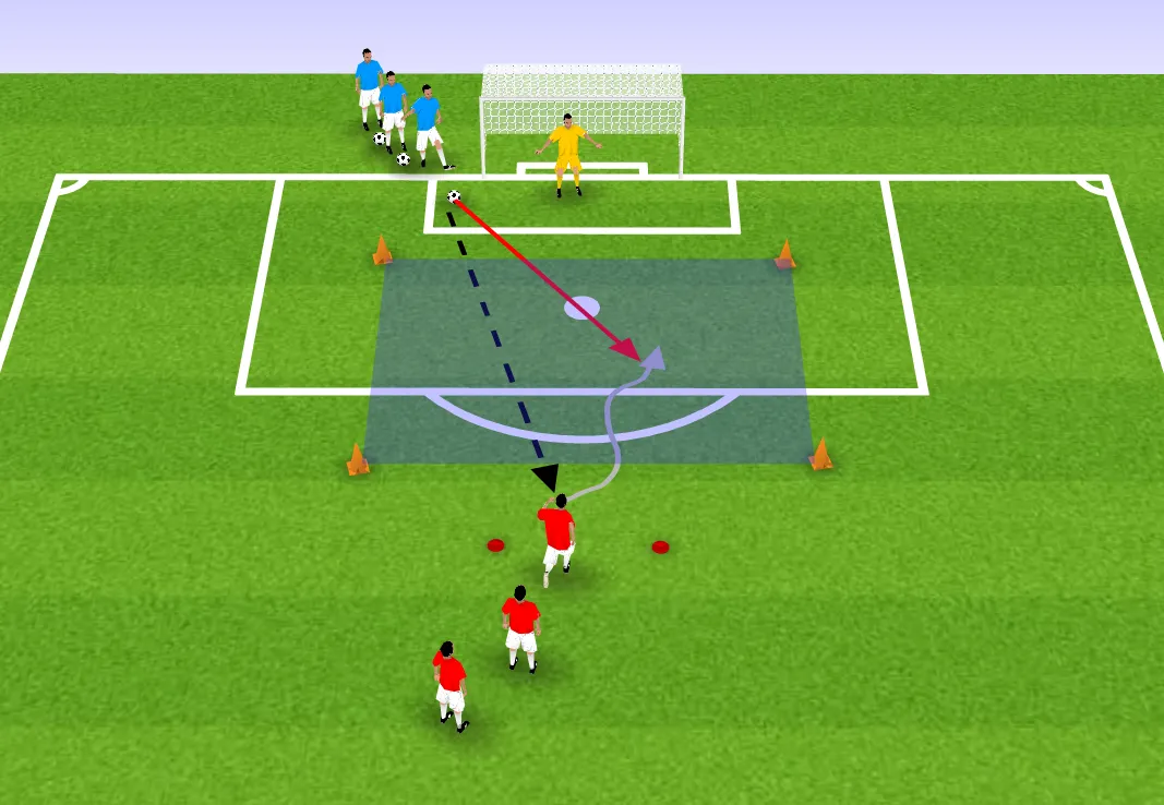 1. 防守球员(蓝队)将球传给进攻球员,传球后防守球员进入对抗区域,正面防守对手。