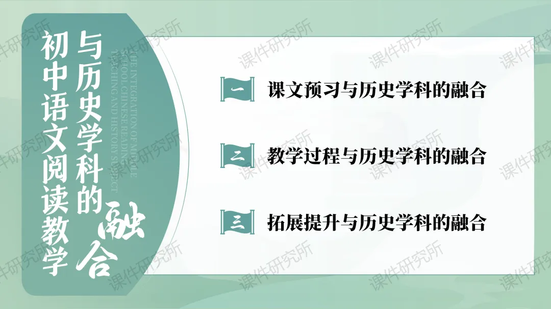 老师从三个方面详细分享了这节课的活动设计步骤:课文预习与历史学科的融合、教学过程与历史学科的融合、拓展提升与历史学科的融合。