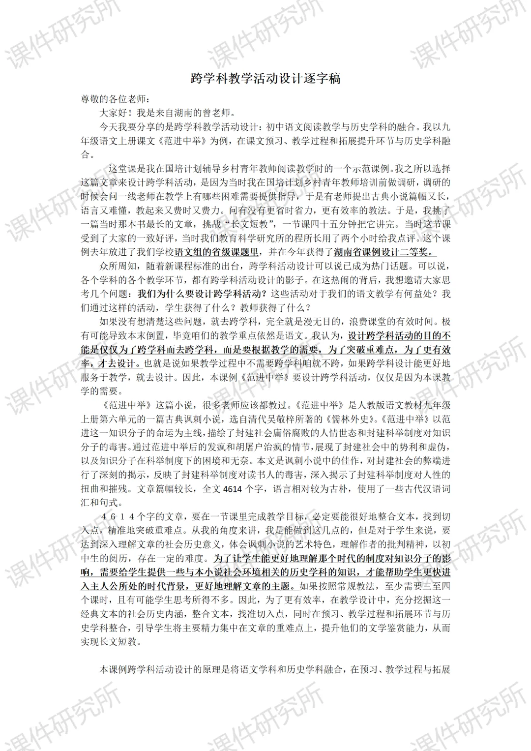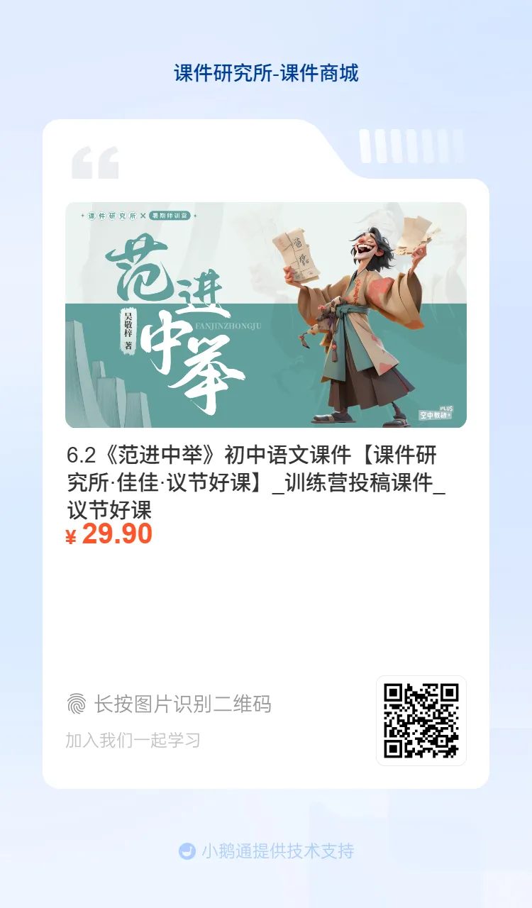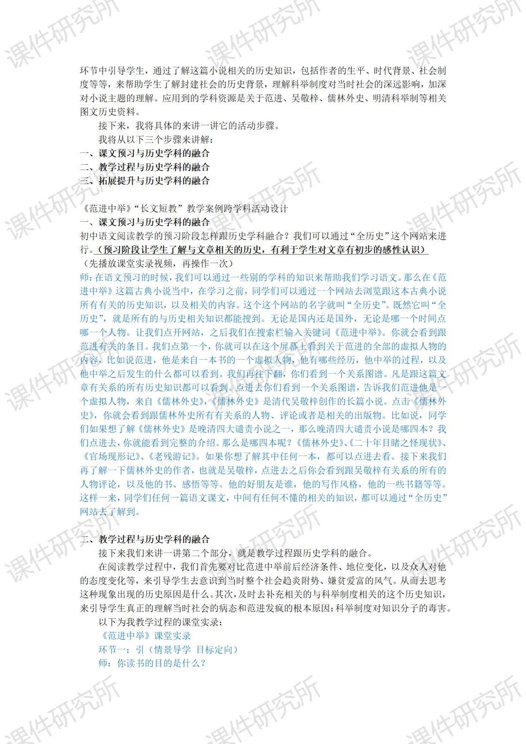 刚好有一个语文跨历史学科的课例《范进中举》,分享老师是一位国培专家&赛课评委。
