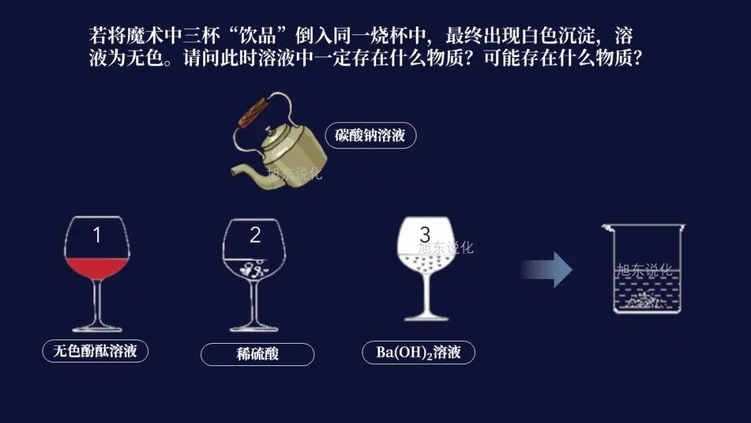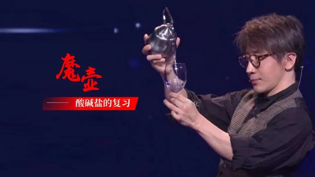 【渡】当然,魔术只是一种舞台艺术,它灵活运用了物理、化学等多种科学原理,所以我们也可以利用所学知识对其进行解密。大部分同学都已发现,刚刚在壶和杯中分别放入一些无色溶液,