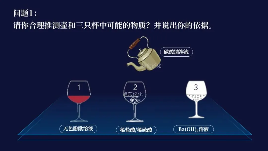 【学生思考并回答】壶中是碳酸钠溶液,杯1是酚酞溶液,因为溶液由无色变为红色可推知遇到碱性物质;杯2是稀硫酸或稀盐酸,因为只有酸和金属或碳酸盐才能产生气体;杯3是氢氧化钙或氢氧化钡溶液或氯化钡、氯化钙,因为其可以与碳酸盐产生白色沉淀。