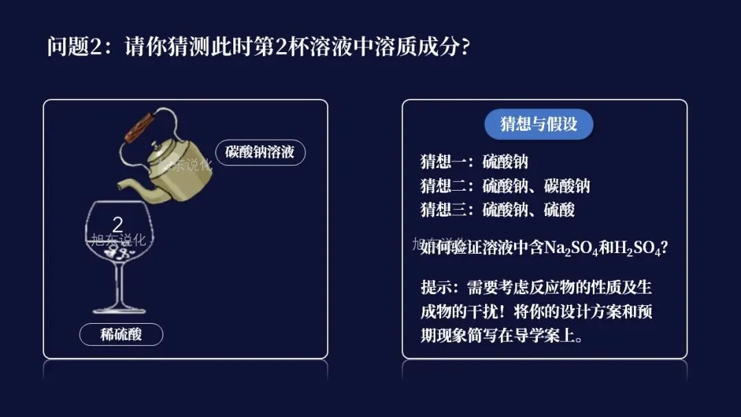 【问】如何验证溶液中含Na2SO4和H2SO4这一猜想?提示:需要考虑反应物的性质及生成物的干扰!将你的设计方案和预期现象简写在导学案上。