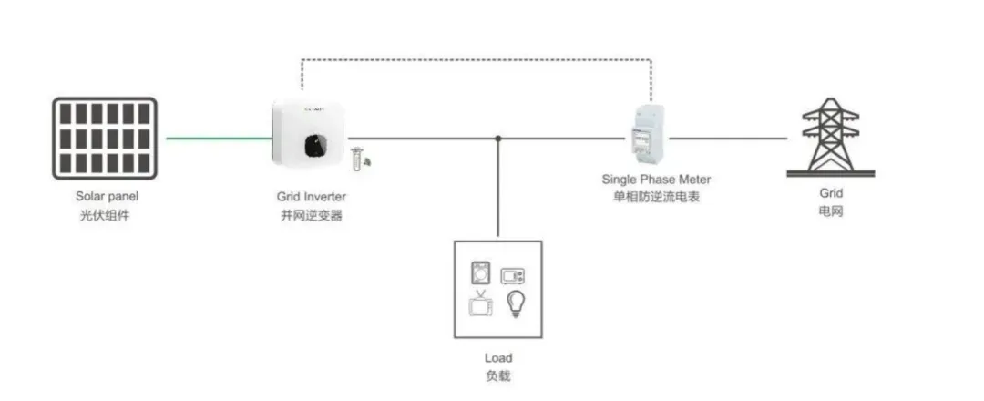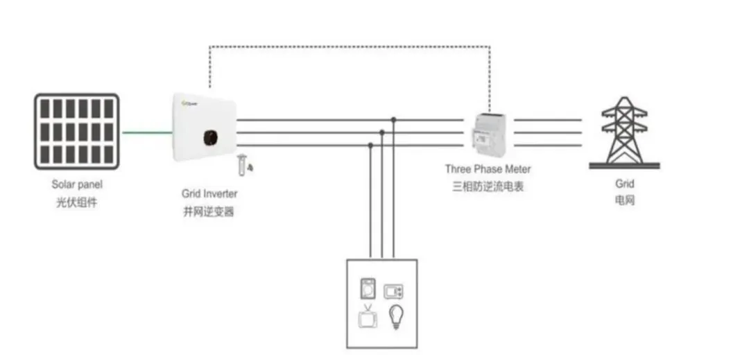功能实现所需设备:光伏并网逆变器、防逆流计量电表、电表和逆变器之间通讯线