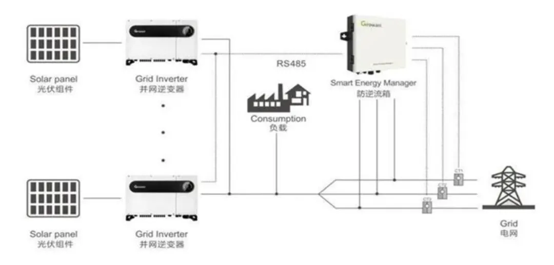 所需设备:光伏逆变器(多台)、防逆流箱(内含数据采集器、防逆流电表和CT互感器)、RS485通信线。系统接线:防逆流箱安装位置在光伏逆变器、用户负载和电网之间,通过防逆流箱内的电表和CT互感器检测并网接入点的电压、电流和逆流功率,可根据用户的需求和设定,实时调节逆变器的输出功率,从而控制整个光伏并网系统最终输出到电网的功率,实现逆流功率接近于零。