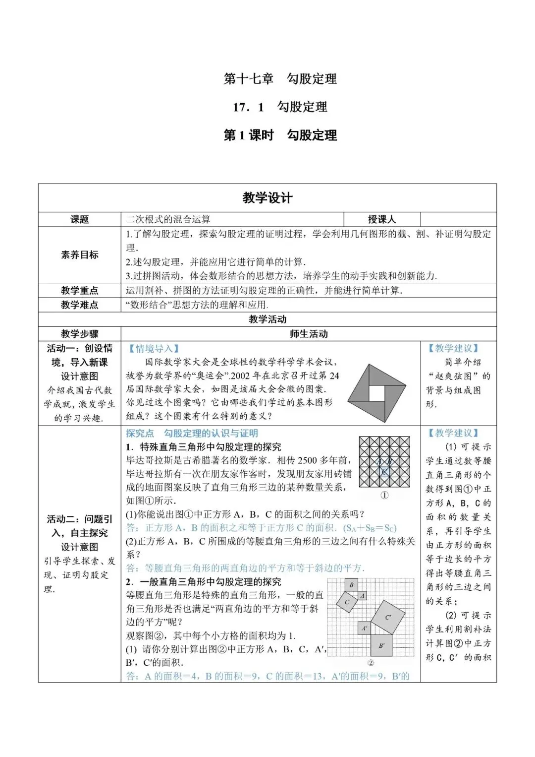 【17.1第一课时《勾股定理》课时教案】
