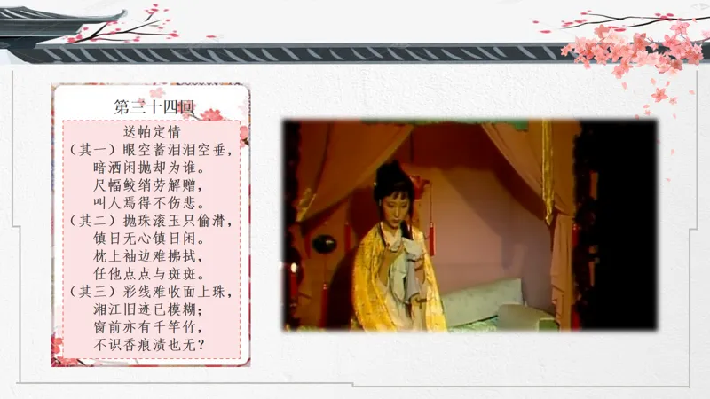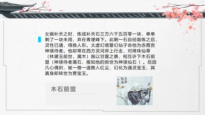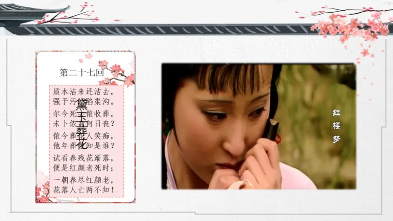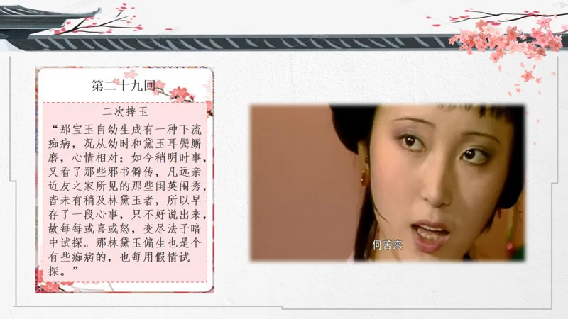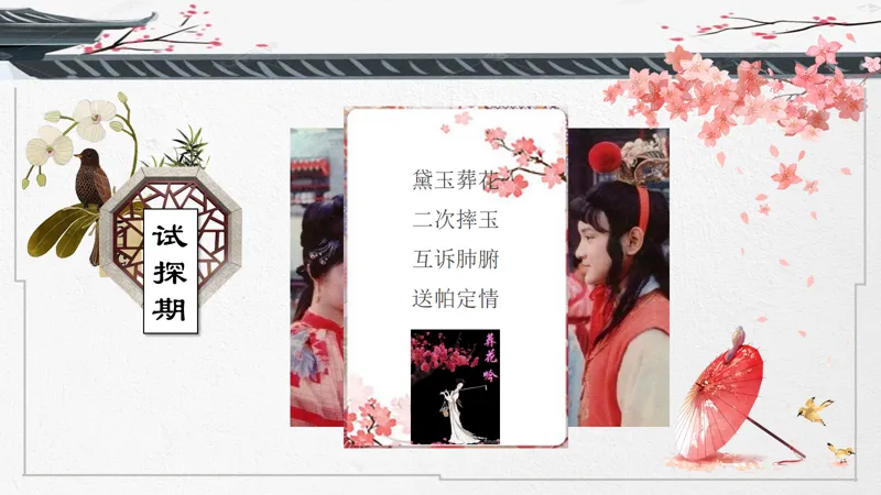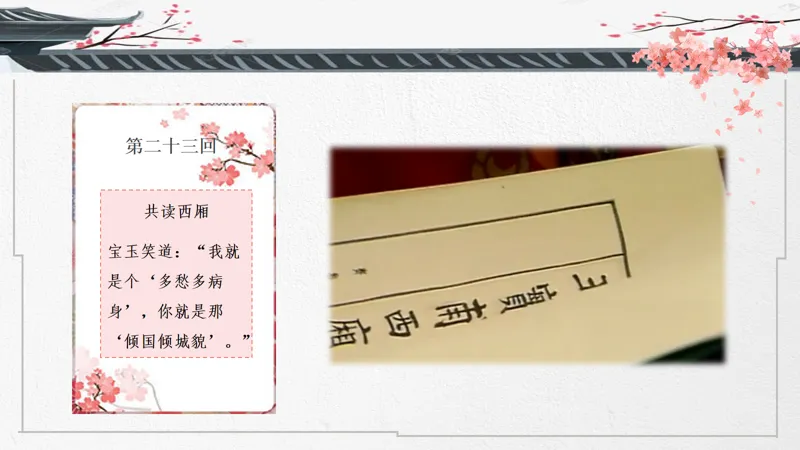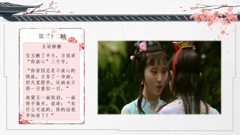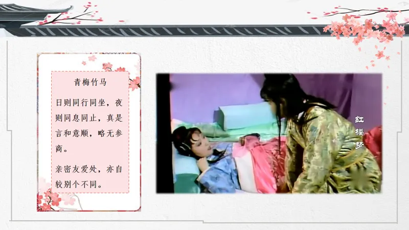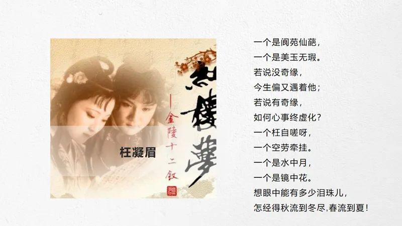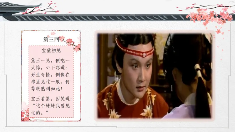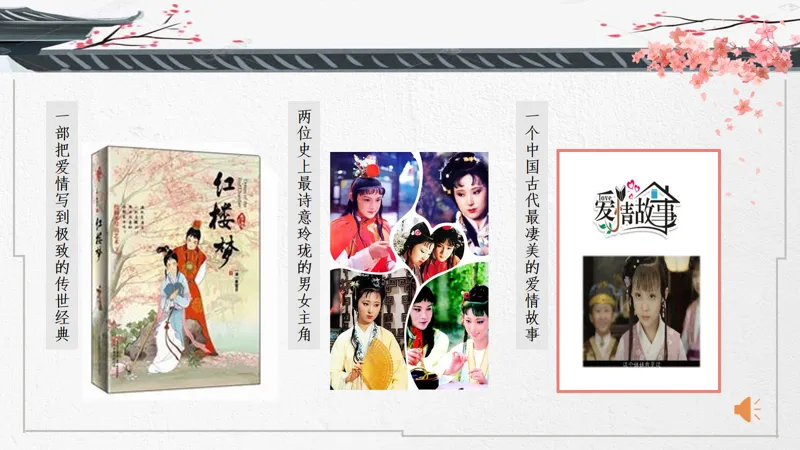 导入语:一部把爱情写到极致的传世经典,两位史上最诗意玲珑的男女主角,一个中国古代最凄美的爱情故事。大家好!这节课我们来讲讲宝黛爱情。