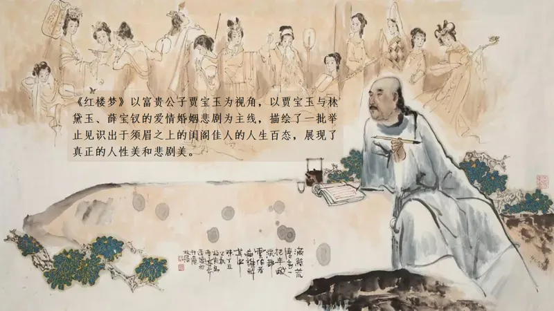 《红楼梦》以富贵公子贾宝玉为视角,以宝黛钗的爱情婚姻悲剧为主线,描绘了一批举止见识出于须眉之上的闺阁佳人的人生百态,展现了真正的人性美和悲剧美。