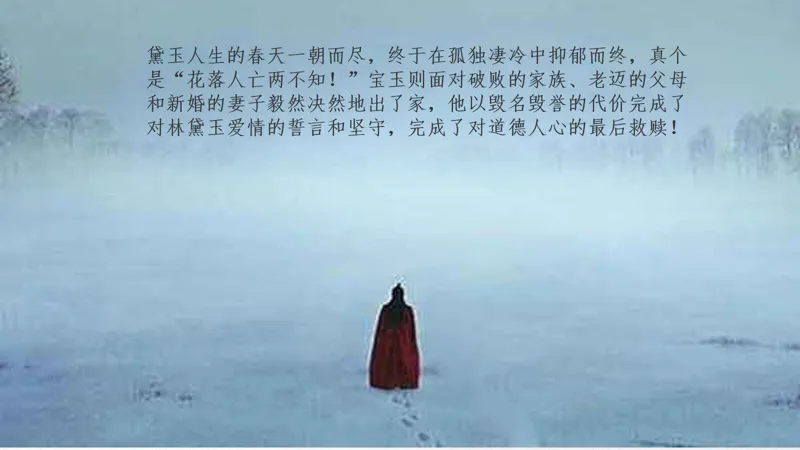 黛玉人生的春天一朝而尽,终于在孤独凄冷中抑郁而终,真个是“花落人亡两不知!”宝玉则面对破败的家族、老迈的父母和新婚的妻子毅然决然地出了家,他以毁名毁誉的代价完成了对林黛玉爱情的誓言和坚守,完成了对道德人心的最后救赎!