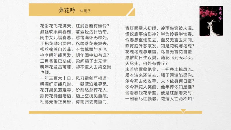 爱情开始了,黛玉常常吃醋,她担心她亲爱的宝哥哥会被别人抢走,所以常常以言语试探,每每引起争吵。有一次黛玉去怡红院访宝玉,吃了闭门羹,眼看着宝玉送宝钗出来而生误会,又触动了寄人篱下的凄凉心境,遂在沁芳桥畔含泪葬花,吟唱《葬花吟》,借落花悲叹自己的命运。
