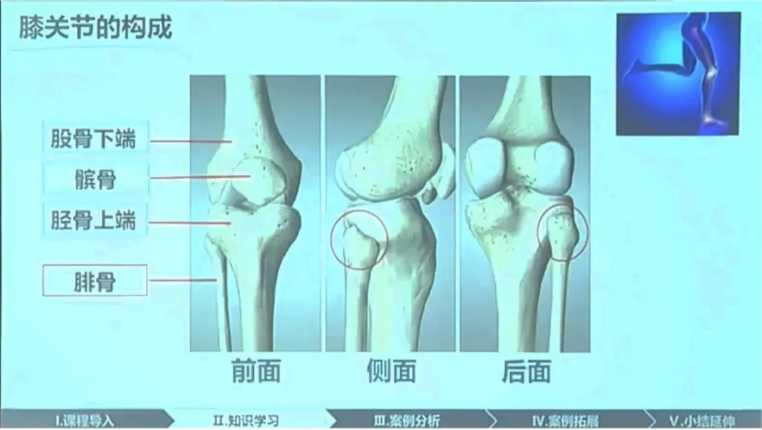 第七届 鲁飞 海南大学 物理化学 卡诺循环与卡诺定理第五届 彭豪 湖南大学 概率论与数理统计 全概率公式第六届 周峰 山东师范大学 概率论与数理统计 离散型随机变量的数学期望结构化导航案例:《膝关节》(郭传瑸/产翠翠):课件首页以树状图清晰呈现教学流程:“Ⅰ.课程导入 → Ⅱ.知识学习 → Ⅲ.案例分析 → Ⅳ.案例拓展 → Ⅴ.小结延伸”,构成清晰的学习地图。