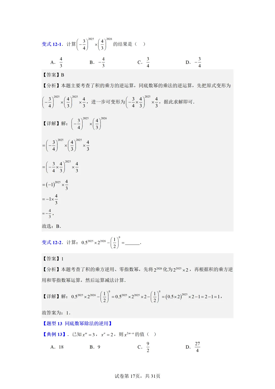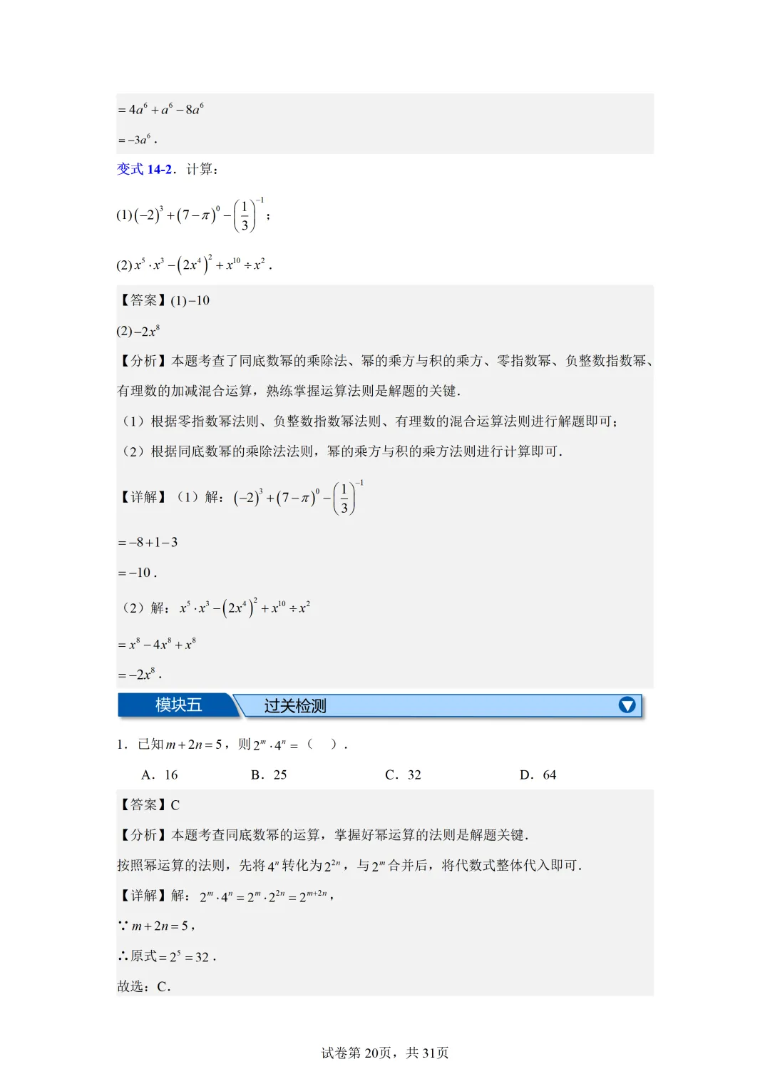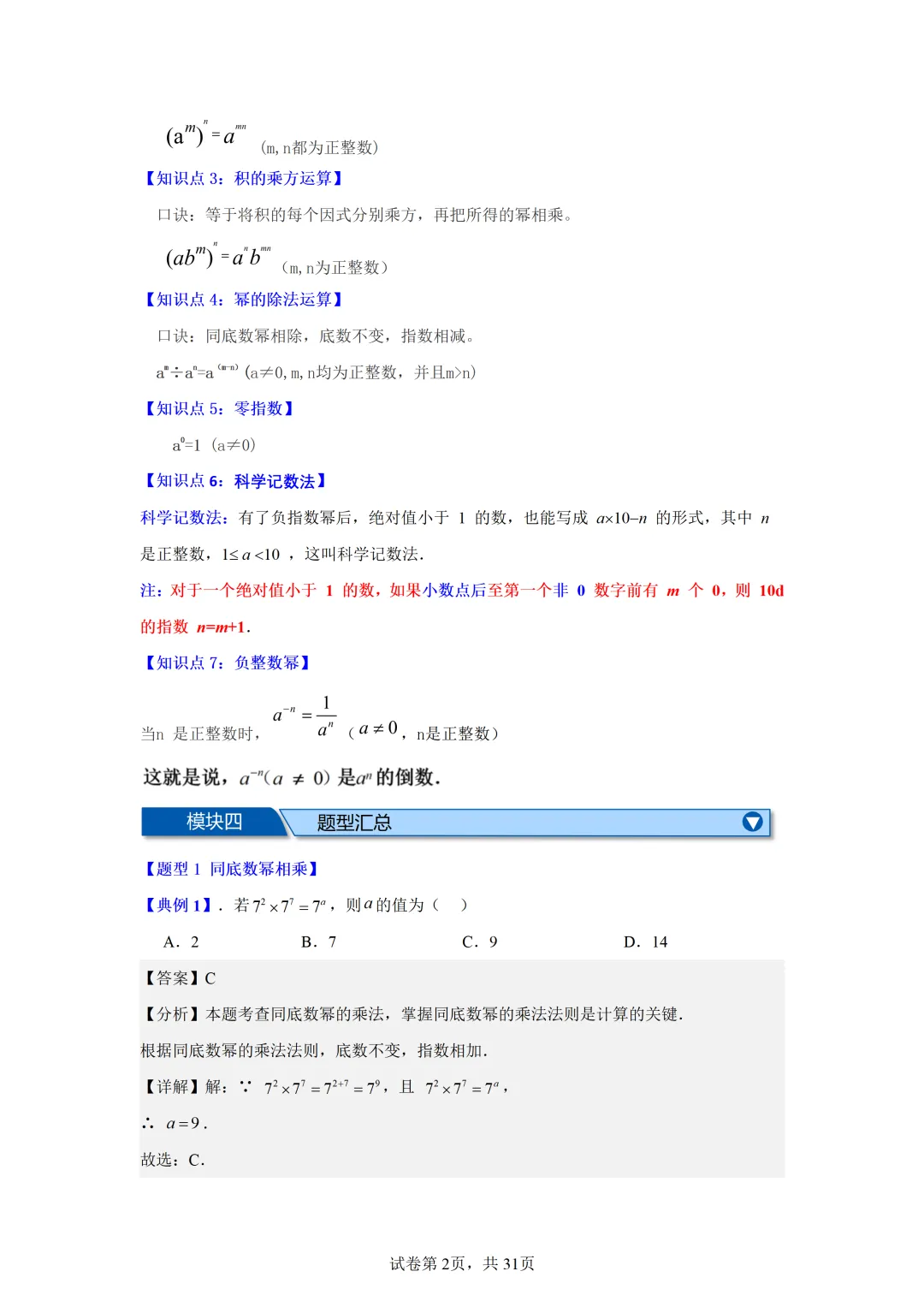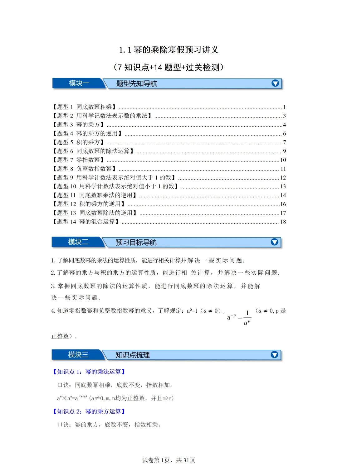 本讲义适配北师大版七年级下册数学 1.1 幂的乘除寒假自主预习,以 “知识点梳理 + 题型突破 + 过关检测” 为核心架构,精准覆盖 7 个核心知识点,囊括同底数幂的乘、除运算,幂的乘方、积的乘方等重点内容,逐一拆解公式推导、适用条件及易错细节,构建完整知识体系。讲义精选 14 类典型题型,按基础巩固、能力提升分层设计,每道题均附详细解析,步骤清晰、思路明确,手把手指导解题方法,帮助学生吃透题型规律。文末配套过关检测,贴合预习难度,全面检验预习效果,查漏补缺。整体内容贴合新教材考纲,适配七年级寒假预习节奏,兼顾基础性与实用性,助力学生衔接旧知、夯实新知,轻松掌握幂的乘除运算技巧,为新学期课堂学习筑牢基础。