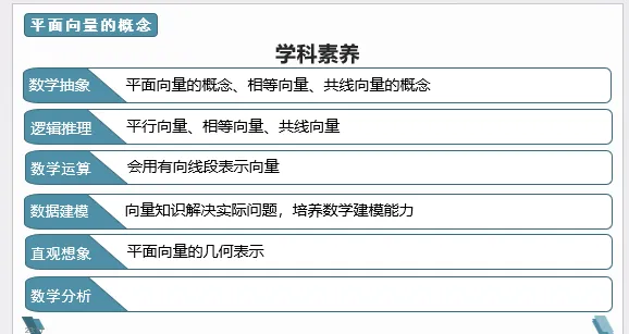 (1)通过对力、速度、位移等的分析,了解平面向量的实际背景;初步认识现实生活中的向量和数量的本质区别.通过类比用带箭头的线段表示位移,理解用有向线段表示向量,进而理解向量的表示;
