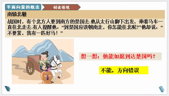 情境一:南辕北辙——战国时,有个北方人要到南方的楚国去.他从太行山脚下出发,乘着马车一直往北走去.有人提醒他:“到楚国应该朝南走,你怎能往北呢?”他却说:“不要紧,我有一匹好马!”
