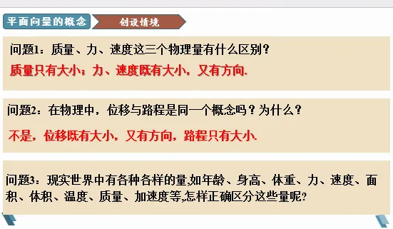 【预设答案】质量只有大小;力、速度既有大小,又有方向.