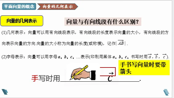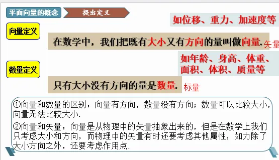 ②向量和矢量:向量是从物理中的矢量抽象出来的,但是在数学上我们只考虑大小和方向,而物理中的矢量有时还要考虑其他属性,如力除了大小方向之外,还要考虑作用点.
