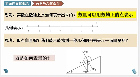 师生活动:教师创设问题情境,引导学生通过类比实数在数轴上的表示及受力分析,得到向量的表示方法.