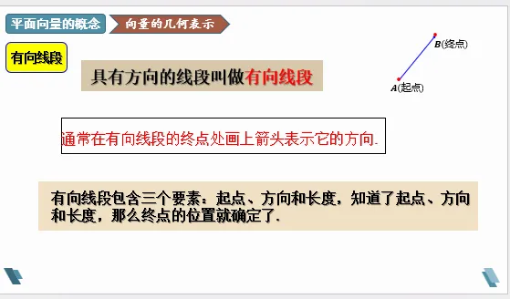 1.有向线段:具有方向的线段叫做有向线段,它包含三个要素:起点、方向、长度