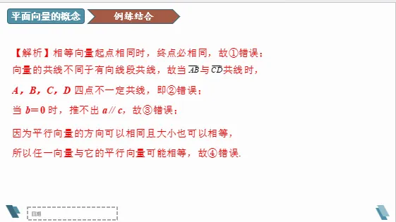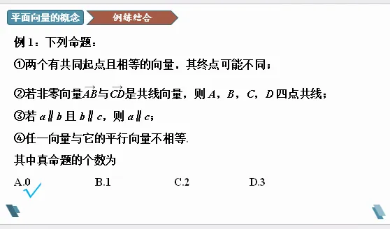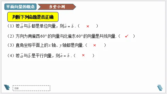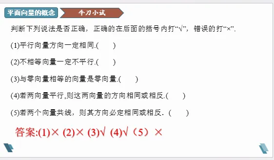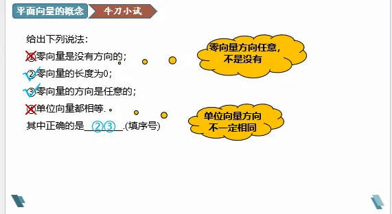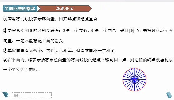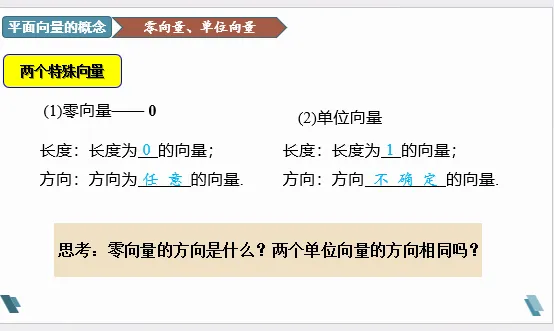 设计意图:通过设问,让学生明确零向量方向是任意的,而单位向量的方向是不确定的。