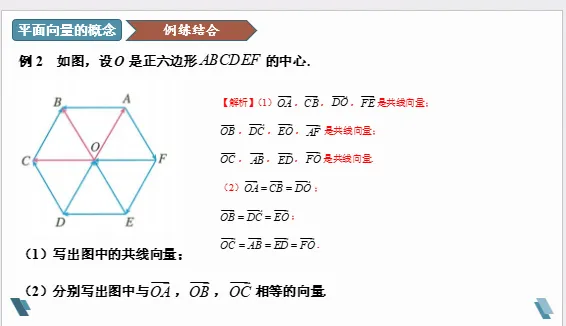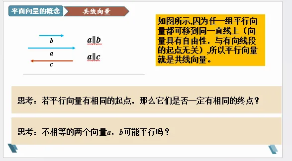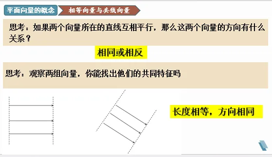 理解平行向量、相等向量和共线向量的区别和联系。