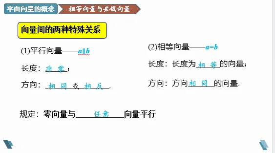 【预设答案】零向量的方向是任意的.两个单位向量的方向不一定相同.
