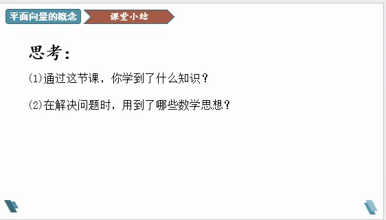 《平面向量的概念》本节课内容包括向量的实际背景与概念、向量的几何表示、相等向量与共线向量。本节从物理学中的位移、力这些既有大小又有方向的量出发,抽象出向量的概念,并重点说明了向量与数量的区别,然后介绍了向量的几何表示、向量的长度、零向量、单位向量、平行向量、共线向量、相等向量等基本概念。