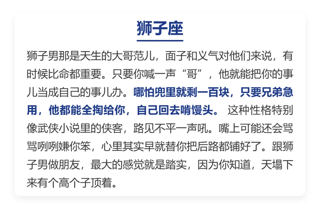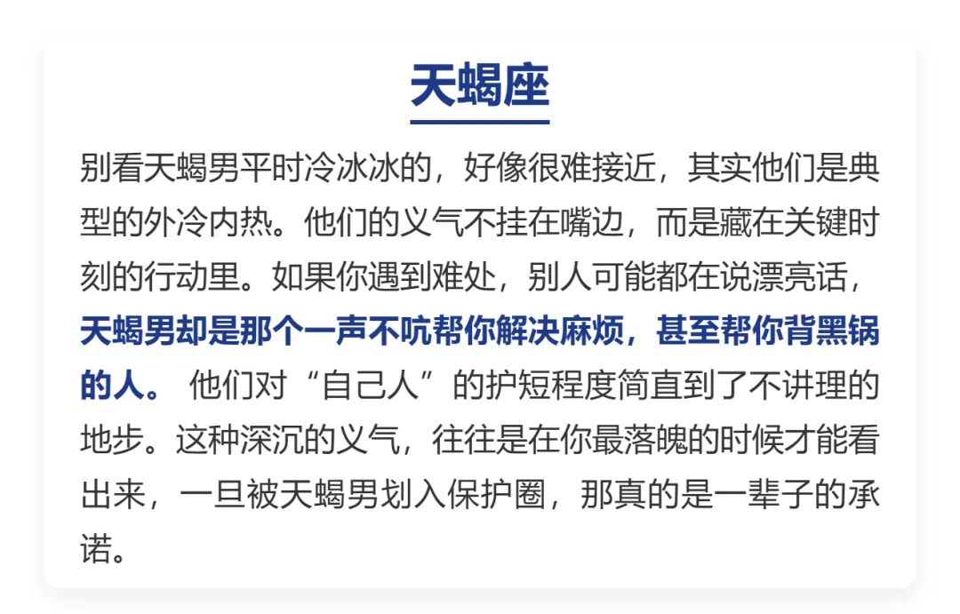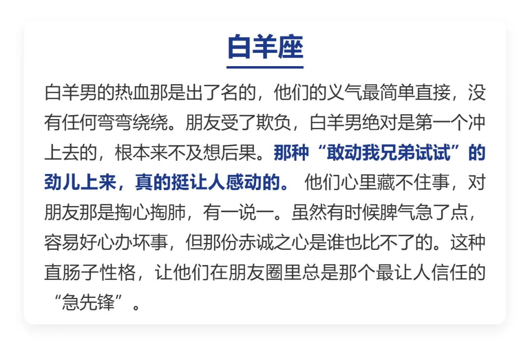 在这.个人情味.儿越来.越淡的年.头,能遇到.一个真.心实.意、肯为你.豁出去.的朋友,那真.是比中.彩票还.难。其实很.多时候,不是大家.变冷.漠了,而是.每个人都.在为了生.活奔波,顾不上.那么多。但总有那.么几.个星座.的男人,骨子.里就.刻着“江湖道义”,只要认定.了你是.兄弟,那真是.哪怕.自己.吃亏,也绝不.让你.受委屈。今天咱们.就来盘盘,哪四个.星座男最.讲义.气。