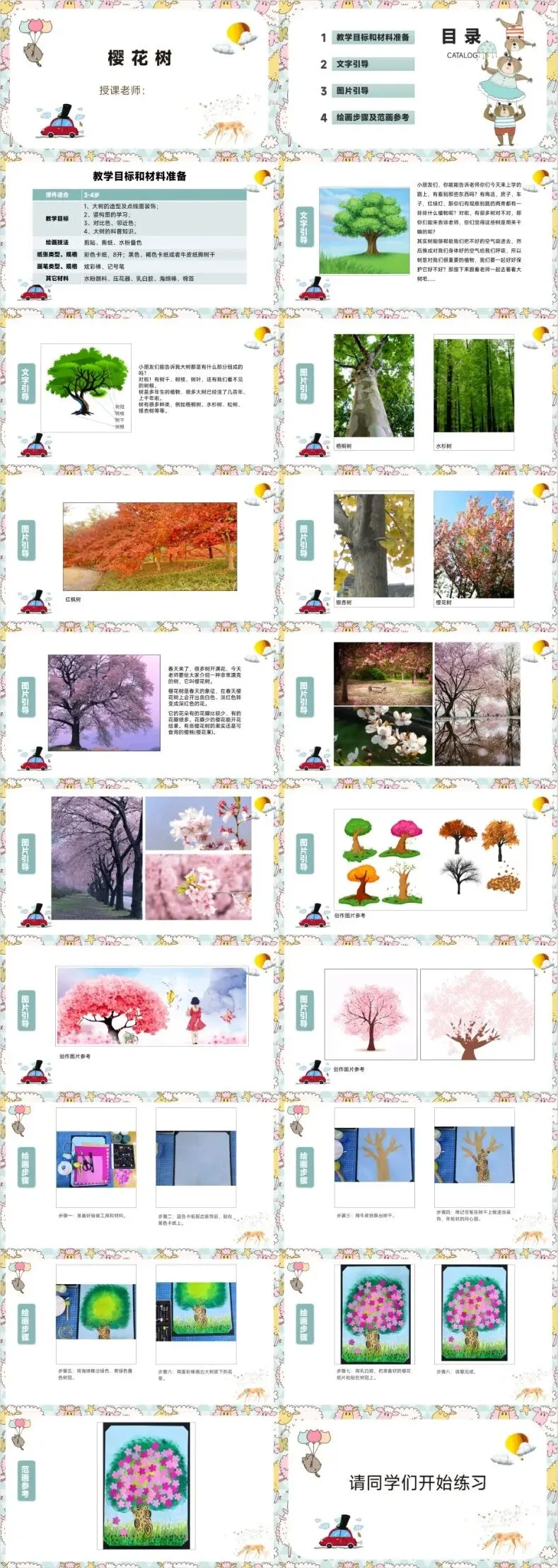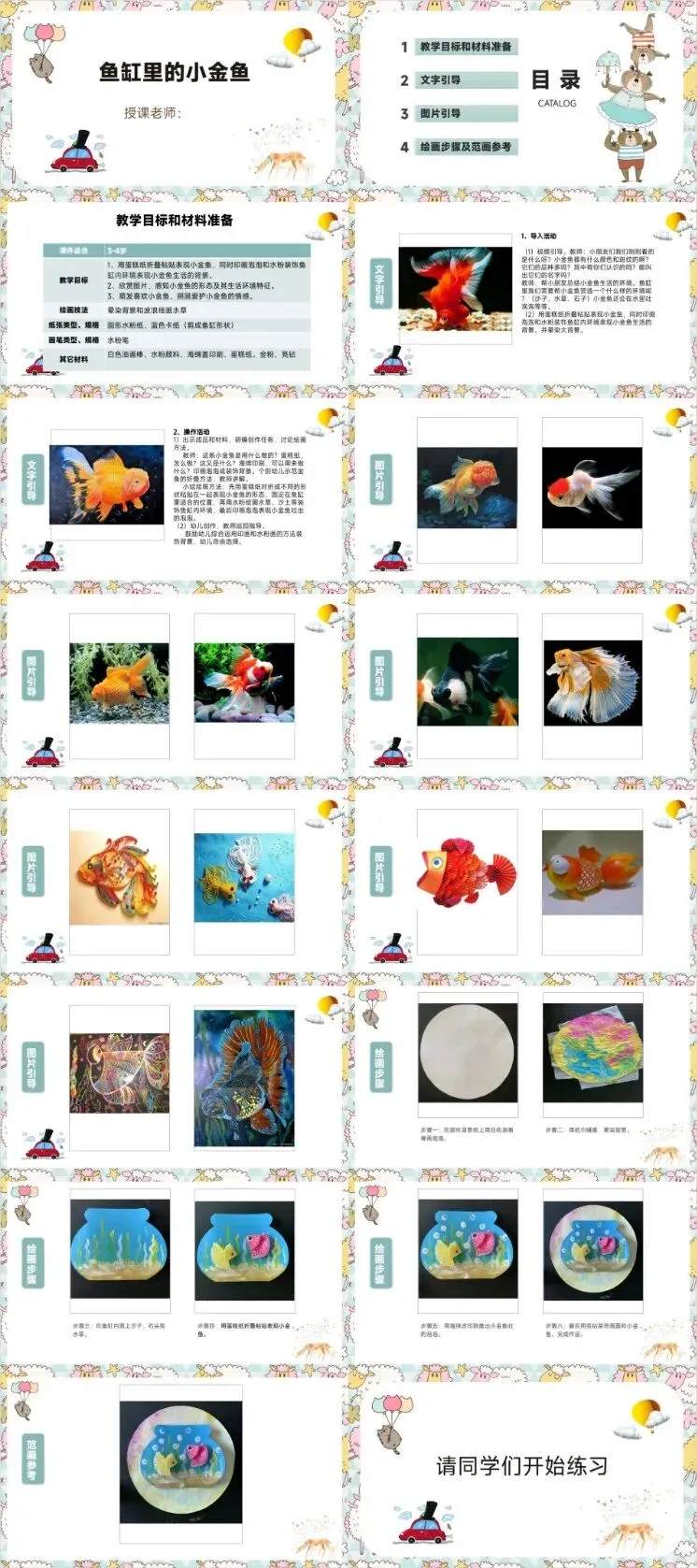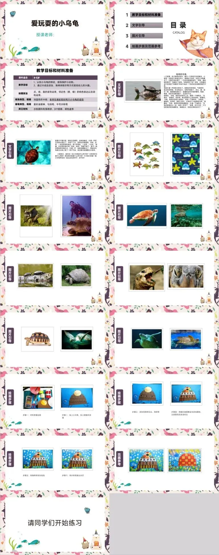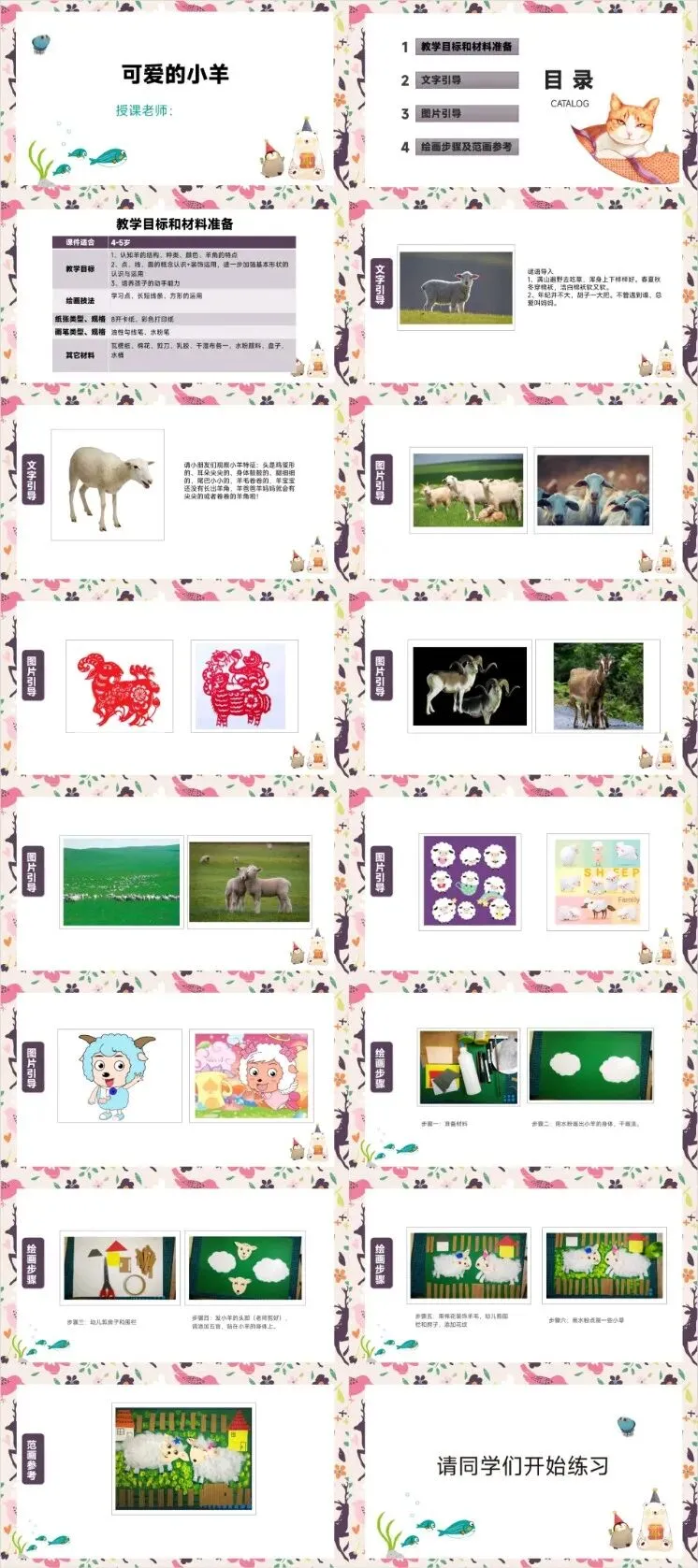 创意美术课件模板【免费自提】‖ 樱花树、鱼缸里的小金鱼、爱玩耍的小乌龟、可爱的小羊、蜘蛛的家、