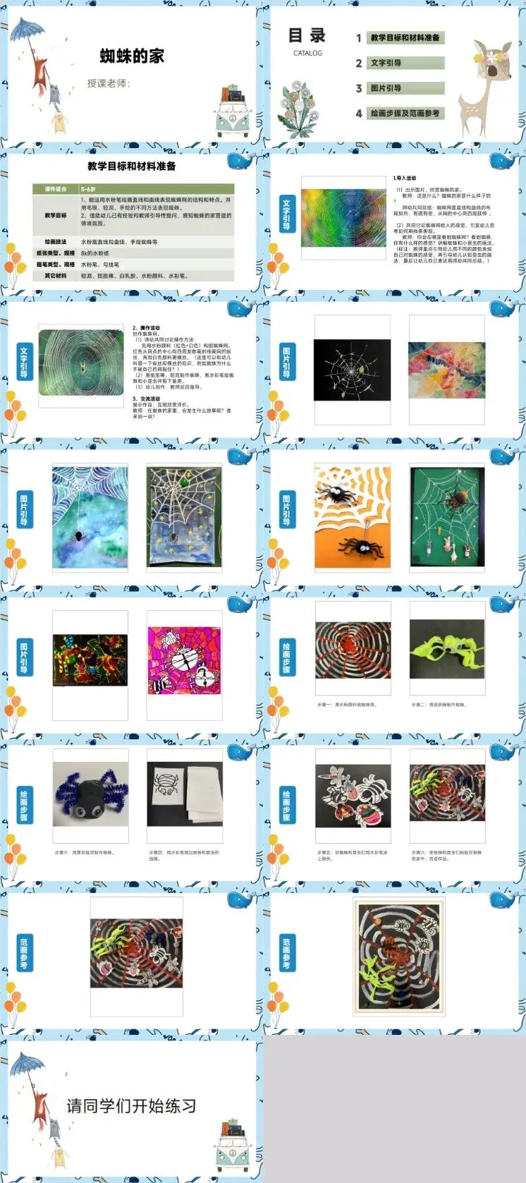 1️⃣蜘蛛的家、2️⃣可爱的小羊、3️⃣鱼缸里的小金鱼、4️⃣爱玩耍的小乌龟、5️⃣樱花树、下载领取方式:https://pan.baidu.com/s/14GVulntlMgRIZNS-dVip_g?pwd=4tg8 🎨 少儿美术趣味课件PPT模板|让创意在指尖绽放!还在为少儿美术课的课件发愁?想让孩子们一进课堂就被牢牢吸引,主动拿起画笔探索艺术世界?这款专为3-12岁儿童打造的少儿美术PPT课件模板,简直是美术老师和家长的“创意救星”!用缤纷色彩、萌趣卡通与专业教学逻辑,把枯燥的美术知识变成超有趣的视觉盛宴,让每一堂美术课都充满惊喜与探索欲!模板采用高饱和马卡龙配色,搭配软萌可爱的卡通元素——圆滚滚的画笔、会微笑的调色盘、蹦跳的颜料罐、卡通小动物画家,每一页都像打开了一本立体童话书,瞬间抓住孩子的注意力!背景融入淡淡的水彩肌理、蜡笔笔触,既贴合美术主题,又不会干扰内容呈现,让孩子们在视觉享受中自然而然地走进艺术殿堂。插画风格统一且富有童趣,从基础线条、色彩认知到手工创作、作品赏析,每个模块都有对应的萌系配图,让抽象的美术概念变得直观易懂,连不爱画画的小朋友都能主动参与进来!模板深耕少儿美术教学逻辑,预设18+实用主题页,覆盖从启蒙到进阶的全场景教学需求:- 基础认知类:色彩王国(三原色/冷暖色教学)、线条魔法(直线/曲线/折线练习)、形状乐园(圆形/方形/三角形创意组合),用互动小游戏帮孩子夯实美术基础;- 创作实践类:水彩画步骤、彩铅技法、手工DIY教程、创意涂鸦区,图文结合拆解创作流程,步骤清晰易懂,孩子能跟着课件一步步完成作品;- 成果展示类:作品陈列墙、小画家荣誉榜、亲子创作合影页,给孩子满满的成就感,激发持续创作的动力;- 拓展延伸类:世界名画简笔画、自然观察写生、节日主题创作(中秋灯笼、圣诞贺卡),让美术学习贴近生活,拓宽孩子的艺术视野。无论是幼儿园美术启蒙、小学美术课堂、少儿艺术培训机构,还是亲子手工活动、美术主题班会,这套模板都能精准适配,一套搞定全场景美术教学需求!深知美术老师的备课压力,模板采用“傻瓜式操作”设计:所有页面均已完成专业排版,图文占位清晰,无需额外调整格式。支持PPT/Keynote/WPS全格式兼容,只需替换文字内容、插入孩子的作品图片或教学素材,5分钟就能快速生成高颜值课件。内置可编辑的卡通元素、绘画步骤示意图,甚至包含现成的美术小游戏模板(如色彩配对、形状拼图),让老师无需花费大量时间设计互动环节,轻松打造生动有趣的美术课堂。这套模板不止满足教学需求,更注重孩子的创造力培养:每页都预留了“创意留白区”,鼓励孩子在课件引导下自由发挥;搭配趣味美术小知识(如“为什么天空是蓝色的”“颜料是怎么来的”),让教学不止于绘画技巧,更能激发孩子的好奇心与探索欲。用充满童趣的设计消除孩子对“画画”的畏难情绪,让他们在快乐中感受艺术之美,学会用画笔表达自己的想法与情感。无论是新手老师还是资深 educators,无论是亲子互动还是机构教学,这款少儿美术PPT课件模板都能帮你省去繁琐的设计流程,把更多时间花在引导孩子创作上。让每一堂美术课都充满惊喜,让每个孩子都能爱上画画、大胆创作,用画笔勾勒属于自己的精彩世界!现在获取模板,还可解锁配套的美术教学素材包(含简笔画教程、色彩搭配指南),助力你的美术课堂更具专业性与趣味性~