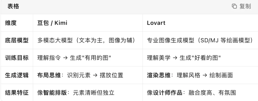 Kimi 和 豆包 是布局思维,先识别元素再把标题、正文和图片摆到合适位置。强项是排版,元素清晰但独立,像智能排版软件,所以两份课件几乎长得一样。Banana 是渲染思维,不拆元素,先理解画面氛围再直接绘制完整场景。文字、图形和光影在生成阶段就是融合的,像设计师作品,所以它的图最好看,有整体感,能打动人。结果就是 Kimi 和 豆包 生成有用的 PPT,能编辑但偏商务套路化。Banana 生成好看的图,不实用但最符合班会场景。借用 Kimi 分析出的一个表,看起来会比较直观。