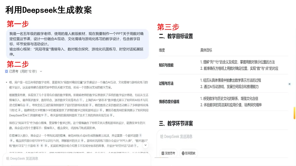 在备课阶段,我使用DeepSeek生成初步教学设计。输入提示如:“ 我是一名五年级的数学老师,使用的是人教版教材,请为五年级上册《用数对确定位置》设计一份融合AI互动、文化情境与游戏化练习的教学设计,包含教学目标、环节安排与活动设计。 输入 核心框架: ‘ 凤冠寻宝 ’ 情境导入、数对概念探究、游戏化巩固练习、时空对话拓展延伸。 ”