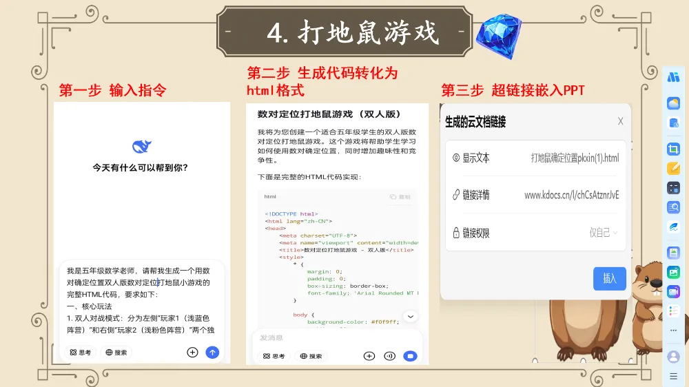 AI输出HTML代码,下载后以超链接形式嵌入PPT,学生可现场操作,在游戏中巩固数对的读写。