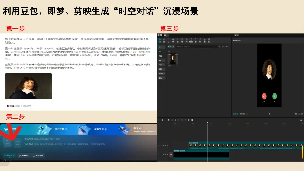 1.豆包生成虚拟人物头像与台词:输入“以笛卡尔的视角,讲解数对的发明灵感(蜘蛛结网),渗透‘数学源于生活、服务生活’的思想”。