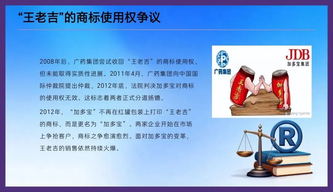 2008年后,广药集团尝试收回“王老吉”的商标使用权,但未能取得实质性进展。2011年4月,广药集团向中国国际仲裁院提出仲裁,2012年底,法院判决加多宝对商标的使用权无效。这标志着两者正式分道扬镳。