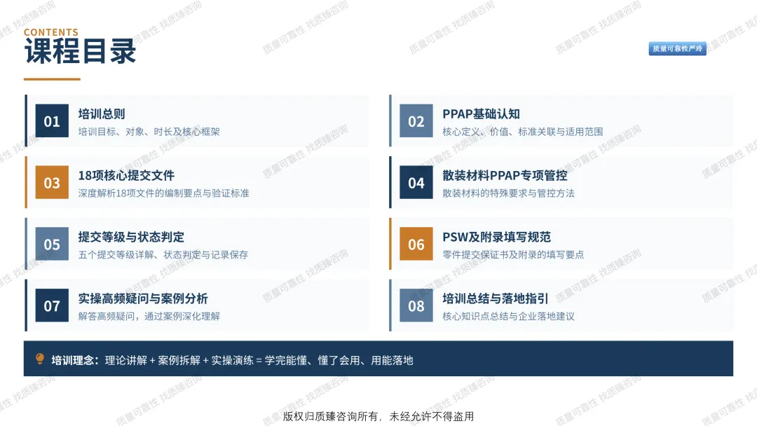 • 常见误区与整改指南手册——汇总PPAP实操高频误区、整改措施,便于学员快速查询,规避同类失误。