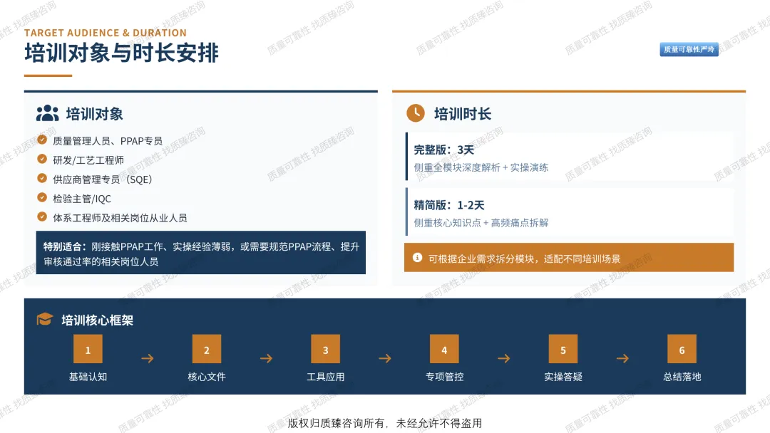 质量管理人员、PPAP专员、研发/工艺工程师、供应商管理专员(SQE)、检验主管/IQC、体系工程师及相关岗位从业人员;特别适合刚接触PPAP工作、实操经验薄弱,或需要规范PPAP流程、提升审核通过率的相关岗位人员。
