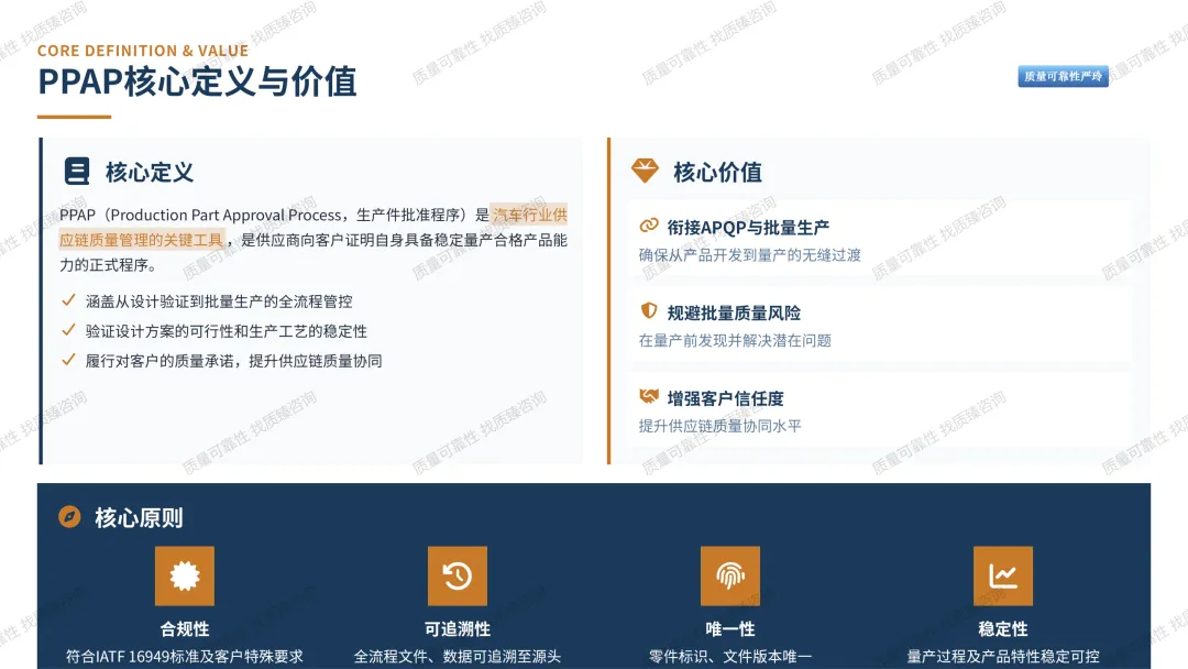 • 核心价值:衔接APQP与批量生产,验证设计方案的可行性和生产工艺的稳定性,规避批量质量风险,履行对客户的质量承诺,提升供应链质量协同水平,增强客户信任度。