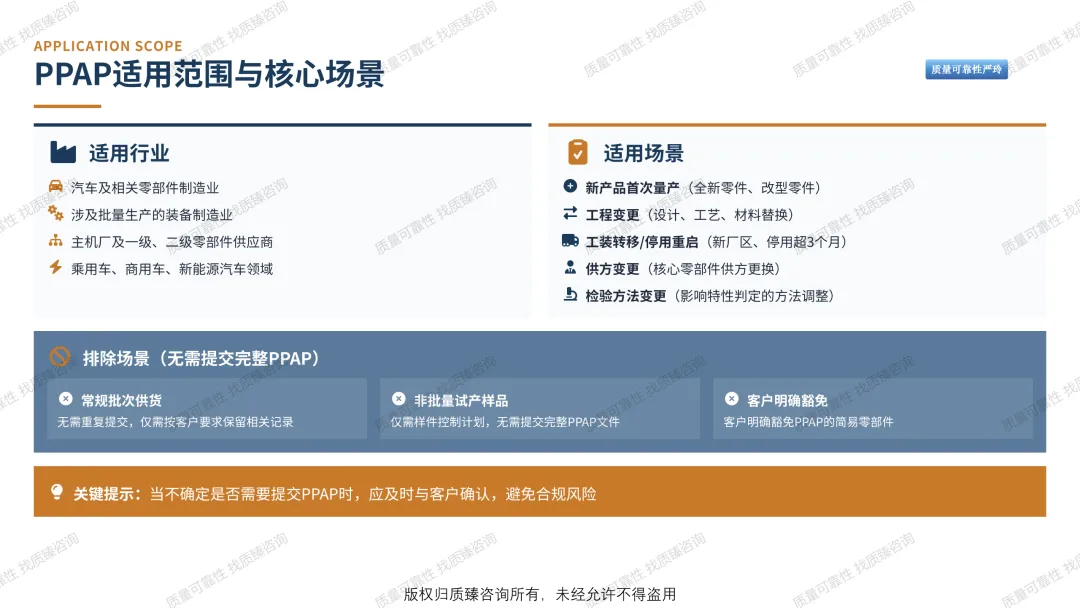 • 排除场景:常规批次供货(无需重复提交,仅需按客户要求保留相关记录)、非批量试产样品(仅需样件控制计划,无需提交完整PPAP文件)、客户明确豁免PPAP的简易零部件。