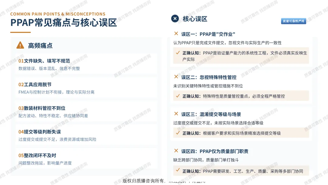 • 核心误区:PPAP是“交作业”(忽视文件与实际生产的一致性)、忽视特殊特性管控(未识别关键特殊特性或管控措施不到位)、混淆提交等级与场景(过度提交或提交不足)、认为PPAP仅为质量部门职责(缺乏跨部门协同)。