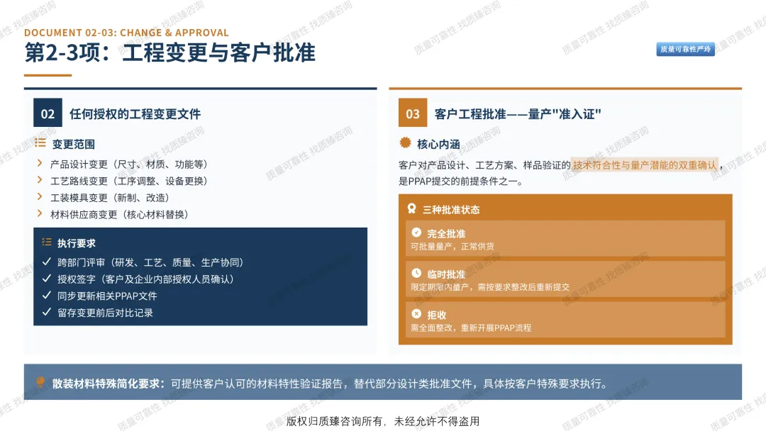 ○ 执行要求:跨部门评审(研发、工艺、质量、生产等部门协同评审)、授权签字(经客户及企业内部授权人员签字确认)、同步更新相关PPAP文件(确保变更后文件一致性)、留存变更前后对比记录。