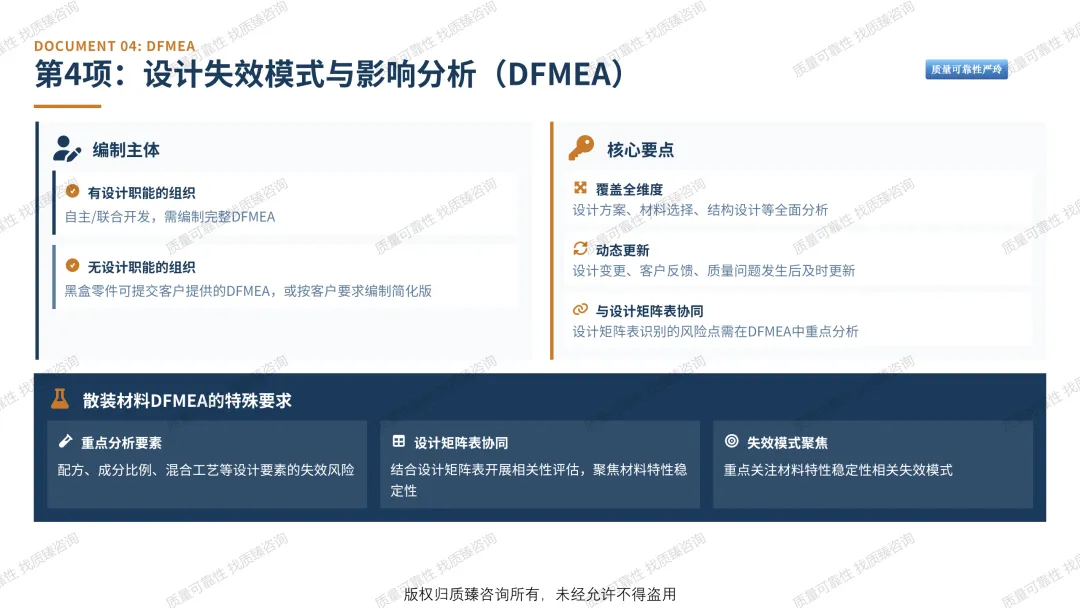○ 核心要点:覆盖全维度(设计方案、材料选择、结构设计等)、动态更新(设计变更、客户反馈、质量问题发生后及时更新)、与设计矩阵表协同(设计矩阵表识别的风险点需在DFMEA中重点分析)。