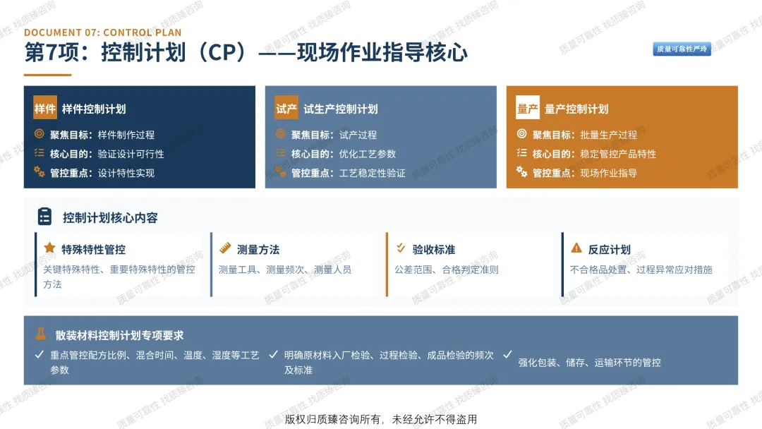 ○ 三阶段版本:样件/试生产/量产控制计划的差异与编制要点:样件控制计划(聚焦样件制作过程,验证设计可行性)、试生产控制计划(聚焦试产过程,优化工艺参数)、量产控制计划(聚焦批量生产,稳定管控产品特性,为现场作业提供明确指导)。