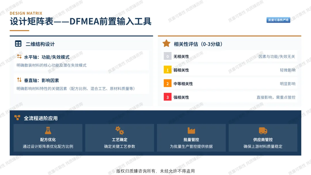 ○ 散装材料DFMEA的特殊要求:重点分析配方、成分比例、混合工艺等设计要素的失效风险,结合设计矩阵表开展相关性评估,聚焦材料特性稳定性相关失效模式。