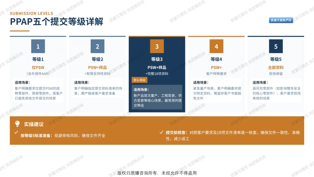 • 等级5:全部资料现场保留——高风险零件与客户现场审核:适用高风险零部件(如影响整车安全的核心零部件)、客户要求现场审核的场景,需将全套PPAP文件现场留存,便于客户随时审核。