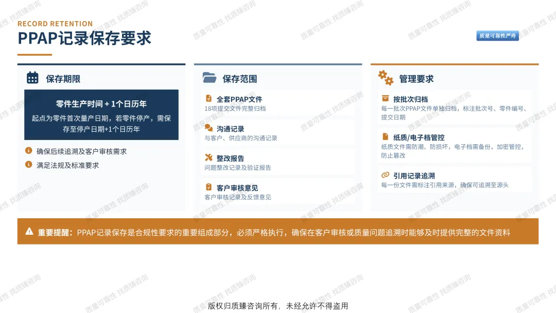 • 保存范围:全套PPAP文件+衍生文件(沟通记录、整改报告、客户审核意见、变更记录、校准记录等),确保全流程文件可追溯。