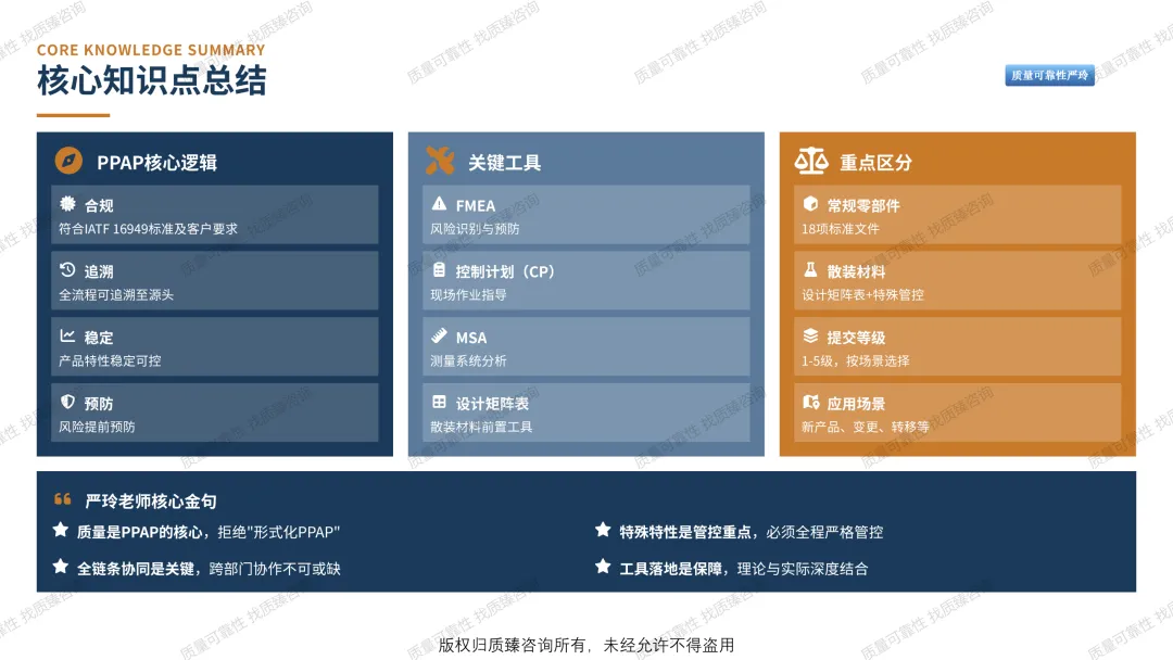 • 聚焦质量初心、特殊特性管控、全链条协同、工具落地等核心理念——质量是PPAP的核心,特殊特性是管控重点,全链条协同是关键,工具落地是保障,拒绝“形式化PPAP”。