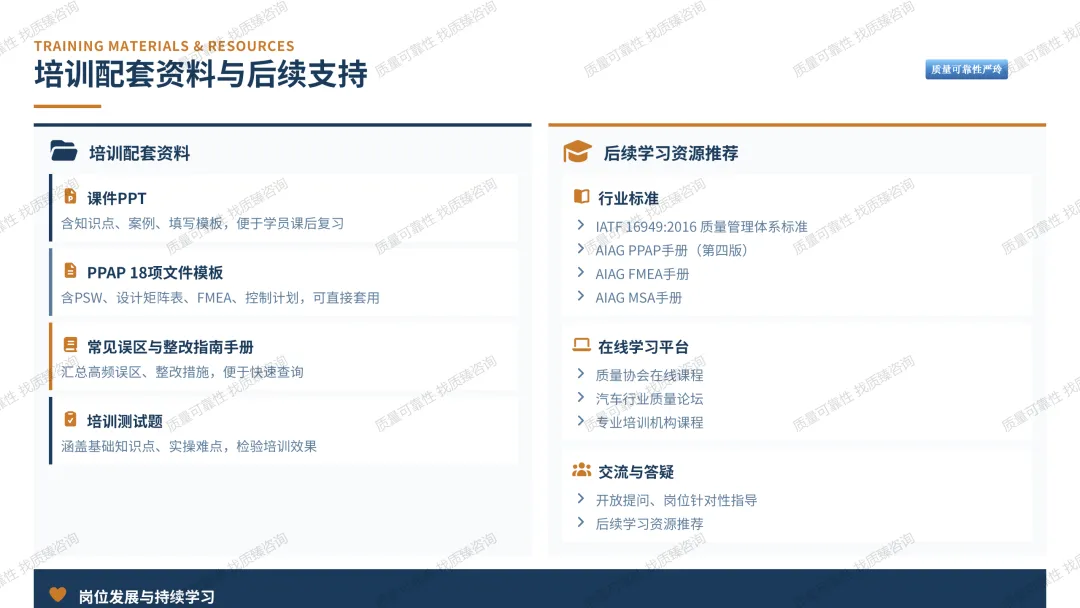 • 岗位发展与持续学习的核心指引——PPAP实操能力是质量岗位核心竞争力,需持续关注行业标准及客户要求更新,不断提升实操能力,实现个人与企业共同成长。