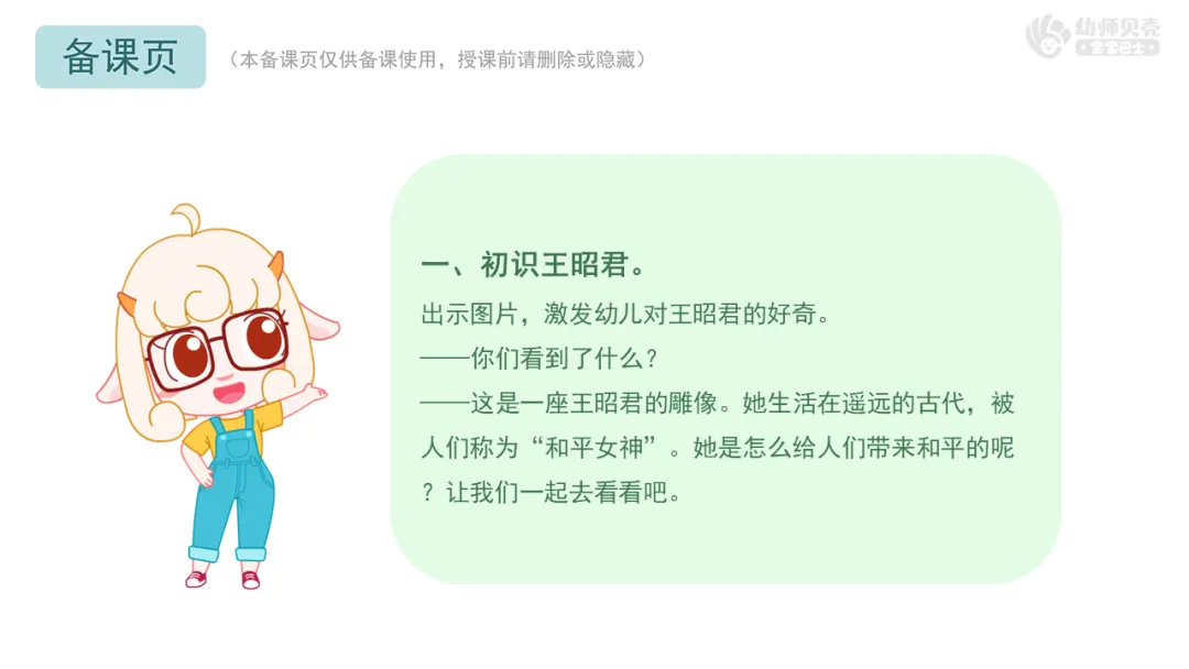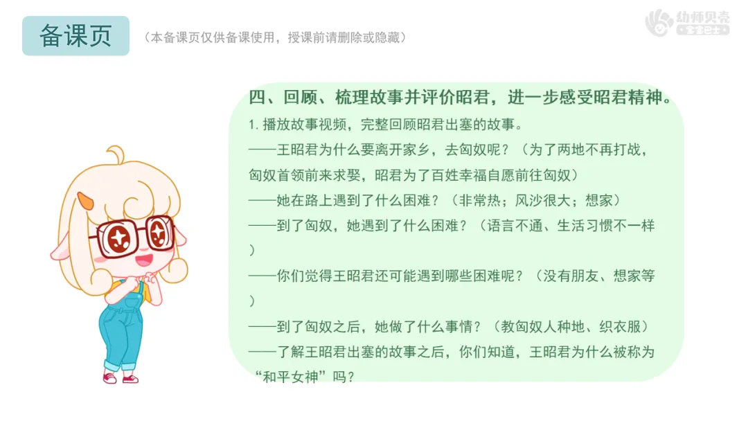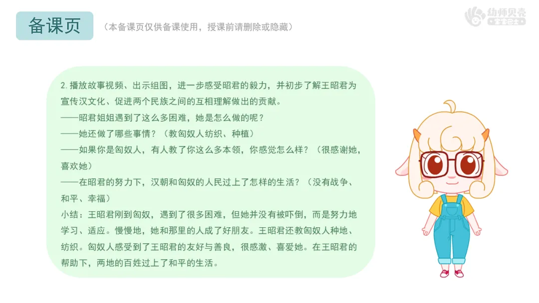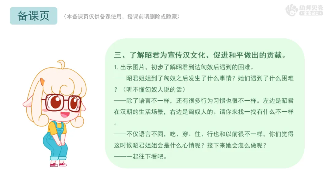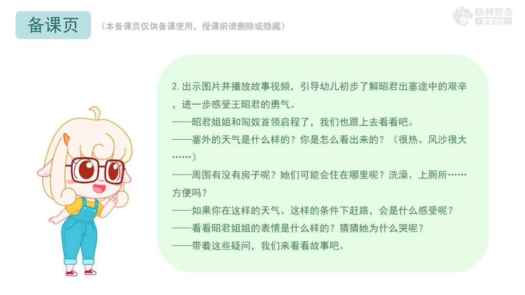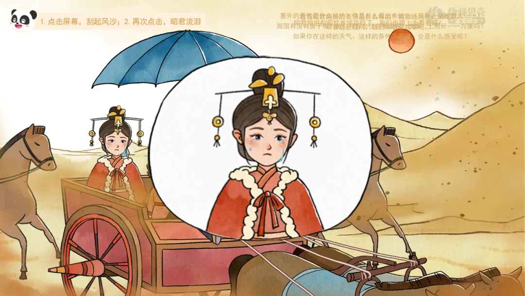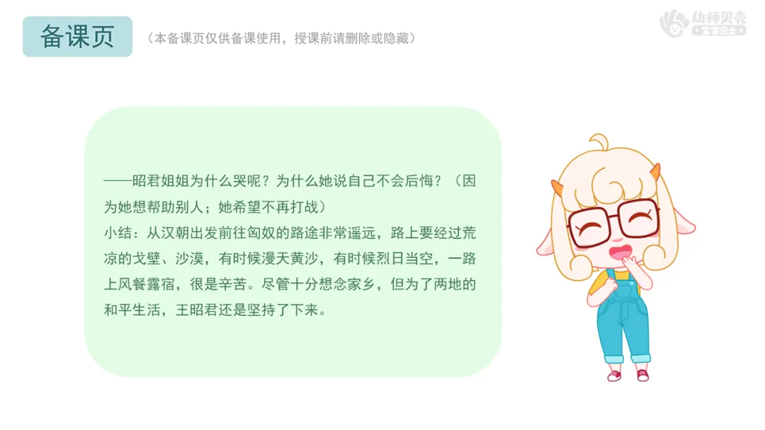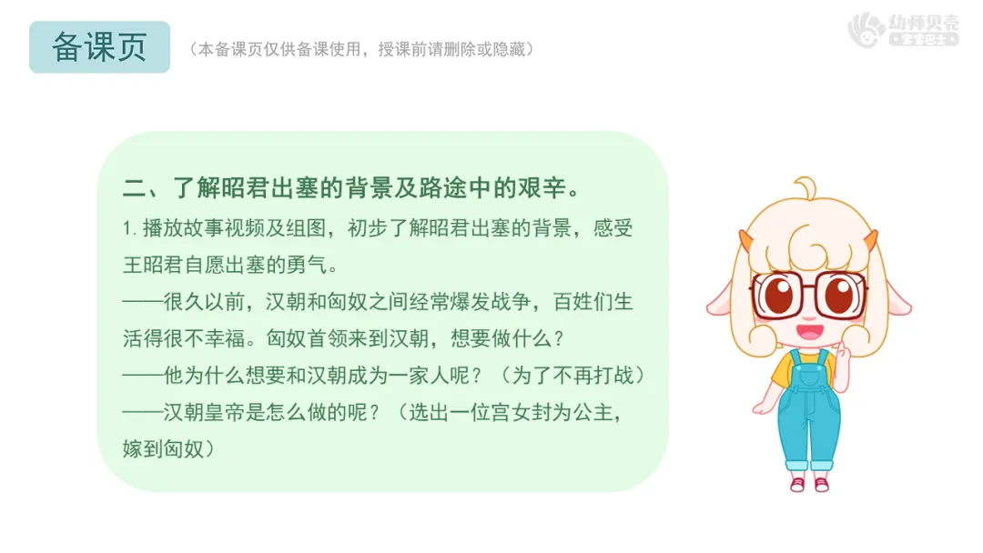 l重点:理解故事内容,了解昭君出塞遇到的困难,感受她的坚韧与勇气。
