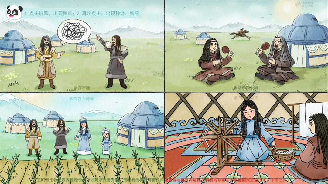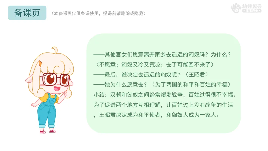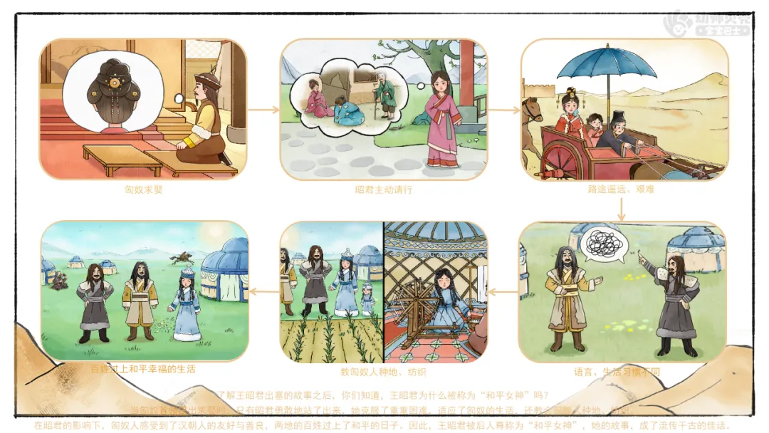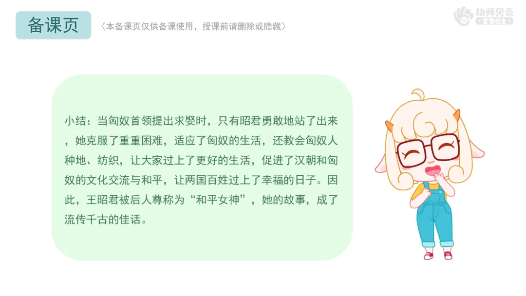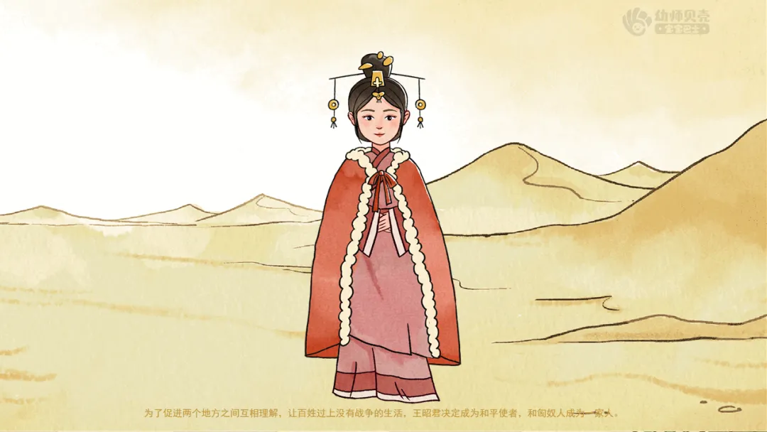 小结:当匈奴首领提出求娶时,只有昭君勇敢地站了出来,她克服了重重困难,适应了匈奴的生活,还教会匈奴人种地、纺织,让大家过上了更好的生活,促进了汉朝和匈奴的文化交流与和平,让两国百姓过上了幸福的日子。因此,王昭君被后人尊称为“和平女神”,她的故事,成了流传千古的佳话。