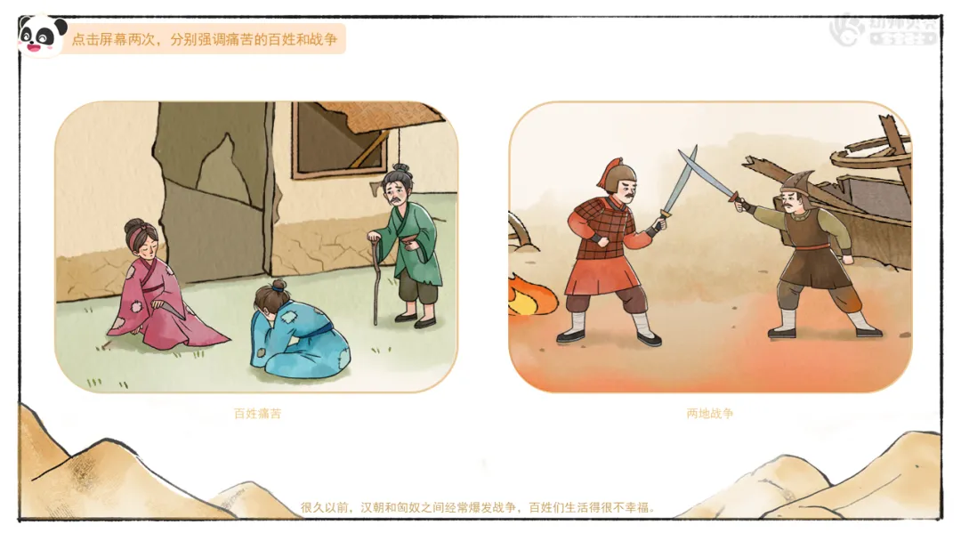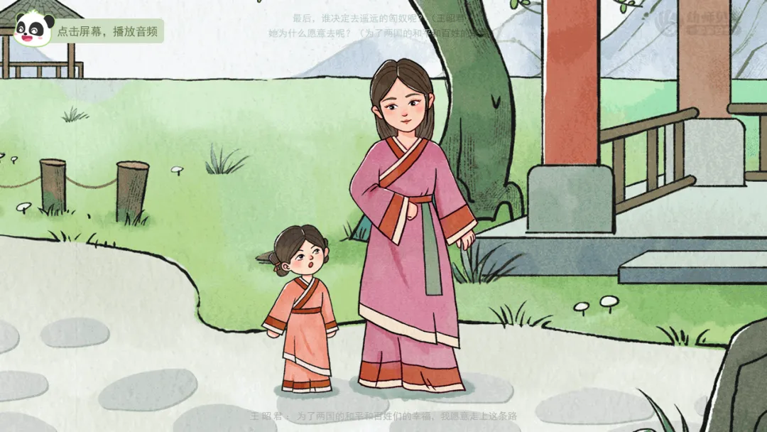 小结:汉朝和匈奴之间经常爆发战争,百姓过得很不幸福。为了促进两个地方互相理解,让百姓过上没有战争的生活,王昭君决定成为和平使者,和匈奴人成为一家人。
