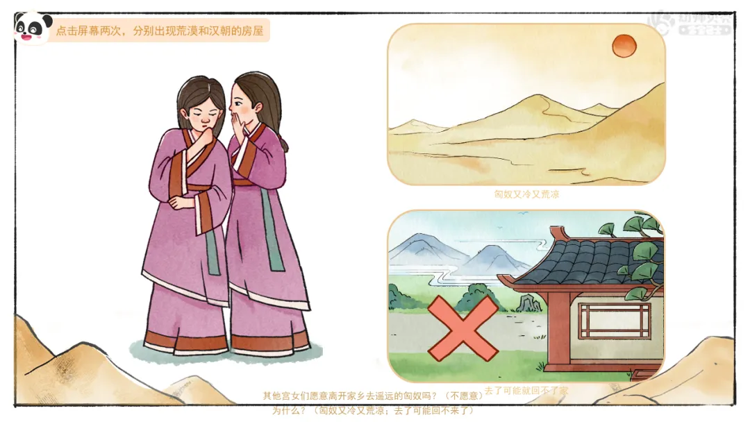 ——其他宫女们愿意离开家乡去遥远的匈奴吗?为什么?(不愿意;匈奴又冷又荒凉;去了可能回不来了)